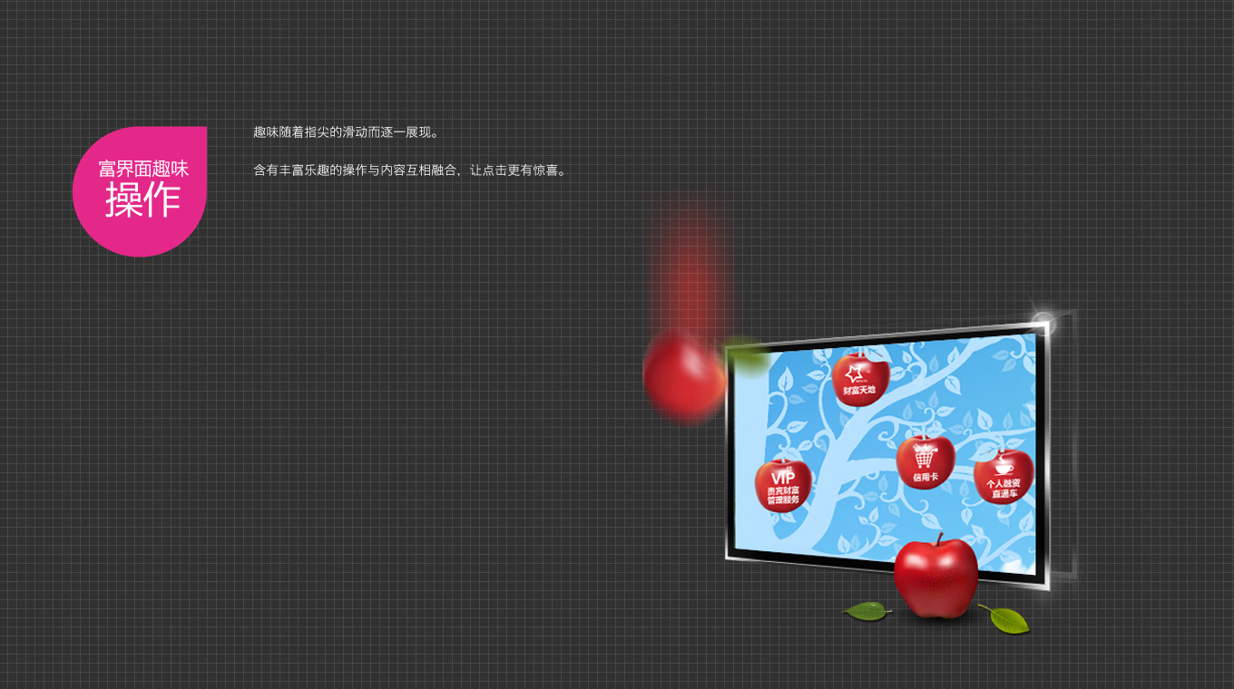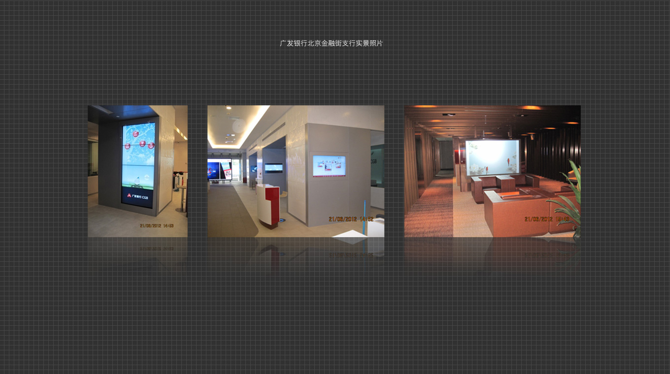 丽网与广发银行一直保持密切合作,参与其中的广发银行智能银行提供触摸多媒体内容解决方案,以精致简洁的界面,配合广发银行细致专业的服务风格,获得了客户的一致称赞。首批多媒体化方案于2013年夏天,安装在广发银行北京金融街支行。